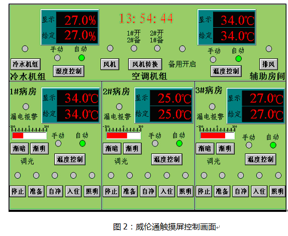 主要功能:溫度、濕度的實時顯示;在自動控制情況下用戶可設定溫濕度的給定值;在觸摸屏上用戶可以做以下操作:溫濕度控制方式的切換;空調機組風機轉換;冷水機組、排風機、風機的啟停;調光亮度控制;病房指示燈的開關??梢杂^察到各個設備的工作狀態(tài)。
