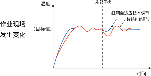 虹潤自適應(yīng)控制技術(shù)可自動整定出較佳PID值。監(jiān)視裝備的溫度控制狀態(tài),自動調(diào)節(jié)PID值,對工件變化及裝備變化、環(huán)境變化等進(jìn)行較佳溫度控制。