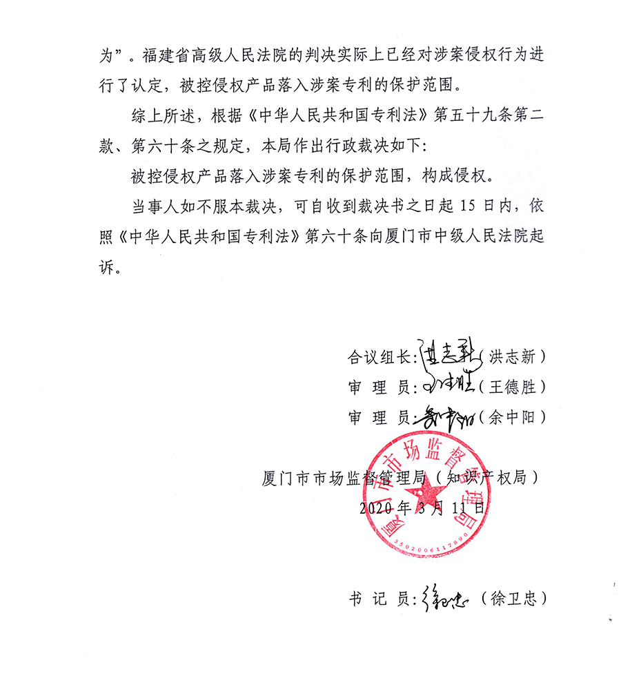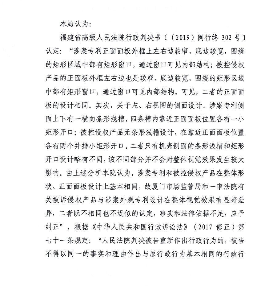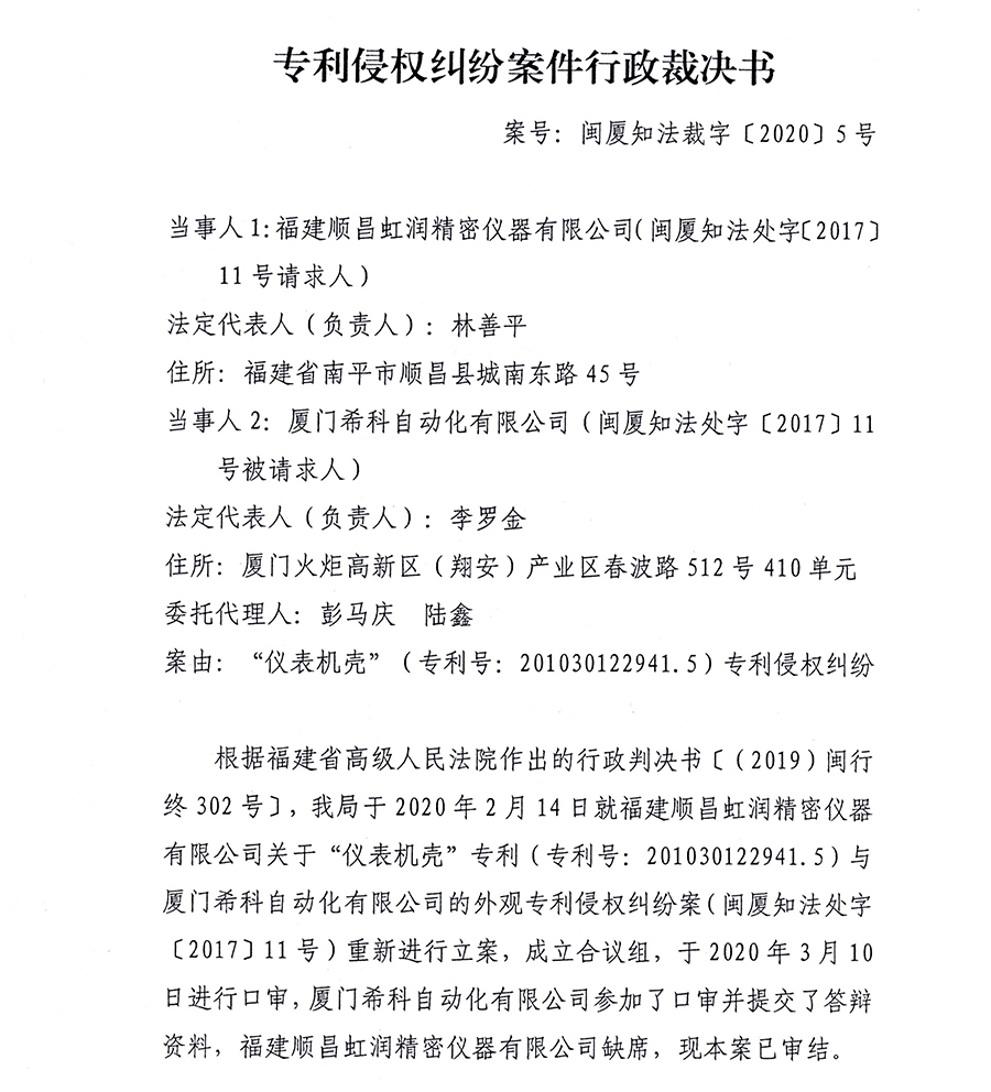 根據(jù)福建省高級(jí)人民法院作出的行政判決書(shū)[(2019)閩行終302號(hào)],廈門(mén)知識(shí)產(chǎn)權(quán)局于2020年2月14日就福建順昌虹潤(rùn)精密儀器有限公司關(guān)于“儀表機(jī)殼”專(zhuān)利(專(zhuān)利號(hào):201030122941.5)與廈門(mén)??谱詣?dòng)化有限公司外觀侵權(quán)糾紛案(閩廈知法處字[2017]11號(hào))重新進(jìn)行立案,于2020年3月10日作出審結(jié)裁決,認(rèn)定廈門(mén)??票豢氐臒o(wú)紙記錄儀侵權(quán)產(chǎn)品落入涉案專(zhuān)利的保護(hù)范圍,構(gòu)成侵權(quán)。