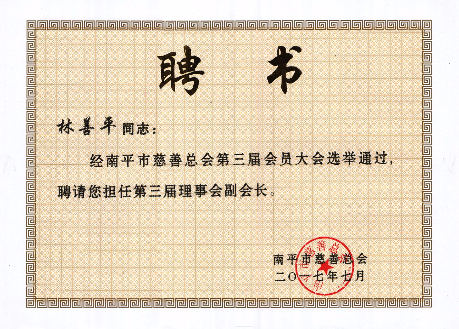 2017年7月28日,南平市慈善捐贈(zèng)大會(huì)暨市慈善總會(huì)換屆會(huì)議在南平市委舉行,福建順昌虹潤董事長林善平再次當(dāng)選為南平市慈善總會(huì)第三屆理事會(huì)副會(huì)長,這也是林善平董事長第三次當(dāng)選此職。同時(shí),在本次慈善捐贈(zèng)大會(huì)上,他再次向市慈善總會(huì)捐款50萬元。他表示,他還將一如既往,繼續(xù)加大對(duì)社會(huì)公益事業(yè)的支持力度,積極投身公益和慈善事業(yè),為南平市的慈善事業(yè)作出更大的貢獻(xiàn)。目前,林善平董事長各項(xiàng)公益捐款累計(jì)已達(dá)1000余萬元。