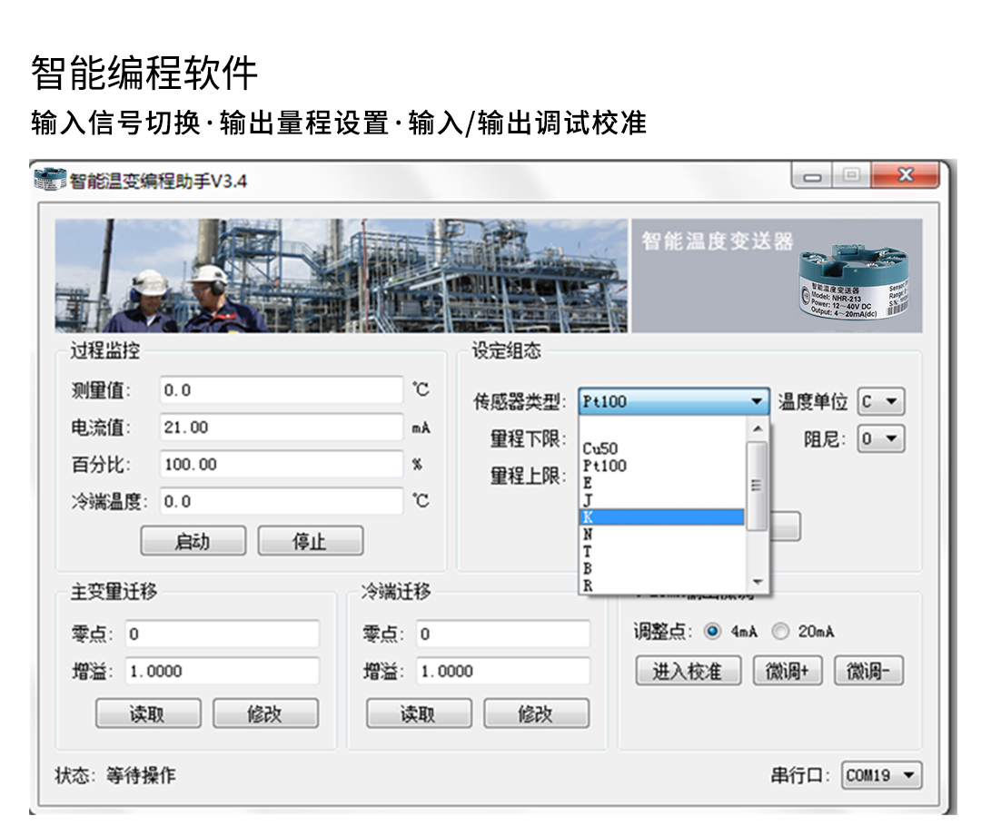 回路供電溫度變送器分為M213智能溫度變送器、M214隔離智能溫度變送器、M215 HART智能溫度變送器,變送器將現(xiàn)場的熱電阻或熱電偶信號經(jīng)過隔離放大處理,轉換為與溫度成線性的二線制4-20mA(HART)信號輸出至控制系統(tǒng)。