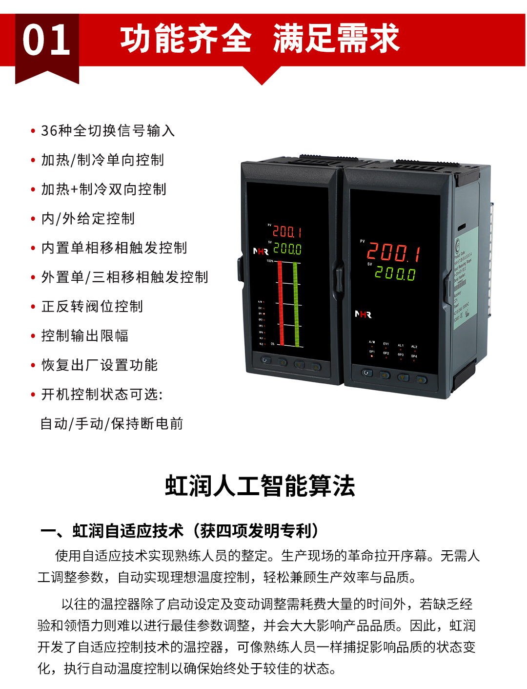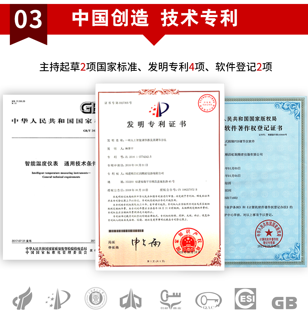 虹潤公司是專業(yè)生產(chǎn)溫控器的國家專精特新“小巨人”企業(yè)。生產(chǎn)的人工智能溫控器,具有真正人工智能算式,無需人工整定參數(shù),控制精度可達±0.1°C,多種輸出類型,高抗干擾等特點。產(chǎn)品獲得模糊PID控制儀及控制方法、人工智能調(diào)節(jié)器、智能化控制器、移相觸發(fā)控制器、閥門自動手動無擾動操作控制方法及裝置等5項國家發(fā)明專利,主持起草工業(yè)過程控制系統(tǒng)用模擬輸入兩位或多位輸出儀表、物聯(lián)網(wǎng)智能溫度儀表通用技術條件、工業(yè)過程測量和控制系統(tǒng)用智能調(diào)節(jié)器等3項國家標準,以及通信系統(tǒng)多通道數(shù)據(jù)采集控制終端規(guī)范軍用標準,參與國際5G標準制定,取得模糊PID溫控儀等3項相關軟件著作權。產(chǎn)品廣泛應用于電力、石化,冶金、制藥、食品等幾乎所有工業(yè)現(xiàn)場,實現(xiàn)精準控溫,保障生產(chǎn)安全與質(zhì)量。