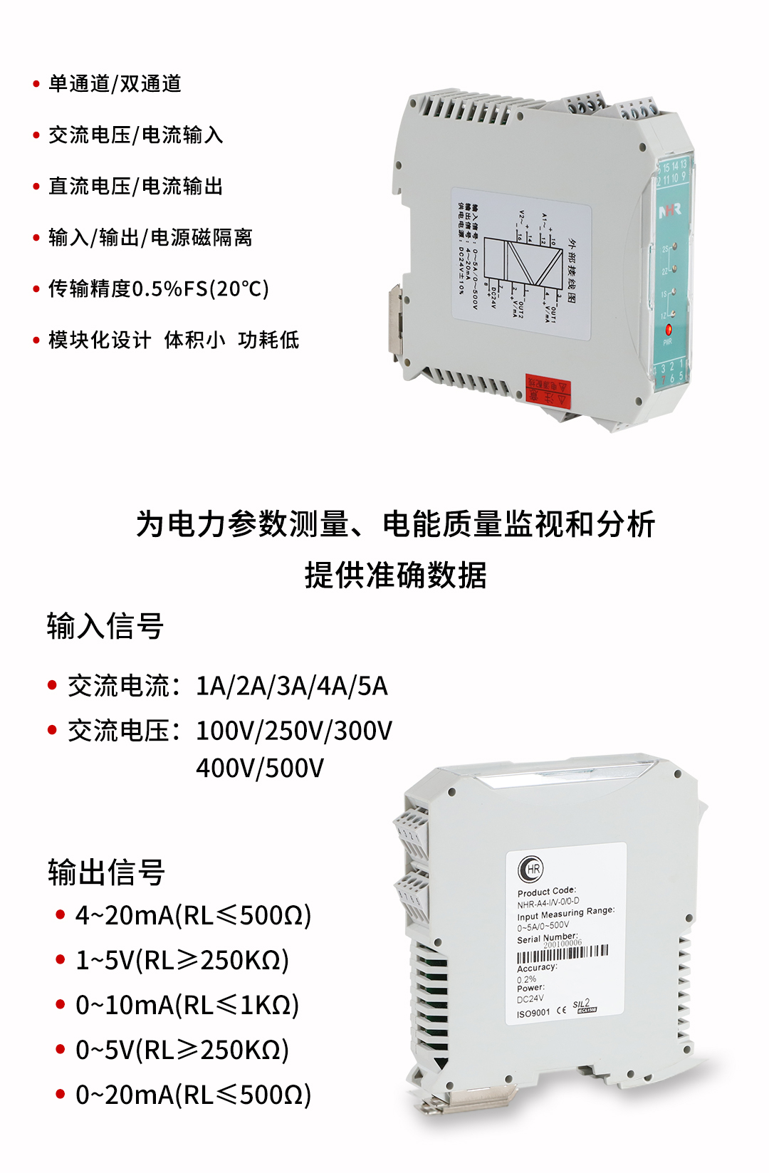 NHR-A4系列簡易型電量變送器用電磁隔離技術,對電網或電路中的交流電流、電壓進行實時測量,它可將被測交流電流、電壓轉換成按線性比例輸出的直流電流或者直流電壓信號,產品具有高精度、隔離電壓高、相應時間快、低漂移、低功耗等特點。